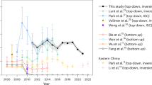 The emissions of CCl4 from emissive uses in China were estimated to be zero using the bottom-up inventory method by Fang et al.7 and Wan et al.21, as they set the consumption of CCl4 for dispersive uses to zero. Although some bottom-up estimations of CCl4 emissions included CCl4 consumption for dispersive uses and other uses (e.g., feedstock), the emission estimates by Bie et al.8 (5.1 ± 3.5 Gg yr−1 in 2014) and Sherry et al.9 (7.3 Gg yr−1 in 2014) were lower than the top-down estimates for 2014 (26.5 ± 8.1 Gg yr−1 by Park et al.11 and 18.2 ± 5.6 Gg yr−1 by Lunt et al.12). Of note, comparisons between bottom-up and top-down CCl4 estimates after 2014 are not possible as post-2014 bottom-up emission estimates are lacking. Thus, further comprehensive bottom-up and top-down studies are strongly recommended to bridge the associated emission gaps for CCl4.