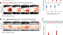 A total 407 h of sleep were recorded across all participants (Supplementary Table 1 and Supplementary Fig. 1). Polysomnography (PSG) data were collected from the Dreem2 PSG headband which provided automated sleep scoring for 30 s epochs according to standard sleep staging (Wake, NREM: N3, N2, N1 and REM) via automated EEG-based sleep staging algorithm which has previously been validated on healthy participants (Fig. 1C)26,27. As N1 generally is difficult to detect and physiologically distinct, we focused our analysis on N2 and N3 stages for NREM sleep (denoted as N2/N3 NREM). Finally, N2/N3 NREM to wakefulness captured by polysomnography were manually re-scored by a board certified sleep physician to corroborate the automated scoring and obtain more precise awakening estimates. PD participants slept on average 7.23 ± 0.19 h per night during the multi-night ON stimulation recording phase (n = 44; total duration in minutes per night: N1 = 34.11 ± 1.38; N2 = 164.54 ± 8.07; N3 = 92.41 ± 10.67; REM = 94.89 ± 6.49; Wake after sleep = 46.59 ± 4.53). In a separate two-night, consecutive ON versus OFF DBS comparison, all four PD participants showed an increase in time of N3 and REM sleep during ON stimulation compared to the OFF stimulation nights (Supplementary Table 1 and Supplementary Fig. 2). Power spectral density plots from intracranial electrodes (Fig. 1G and Supplementary Fig. 4) demonstrated expected classical changes in canonical frequency bands in NREM and REM sleep stages, supporting appropriate dissociation of different sleep stages using portable PSG device sleep staging.