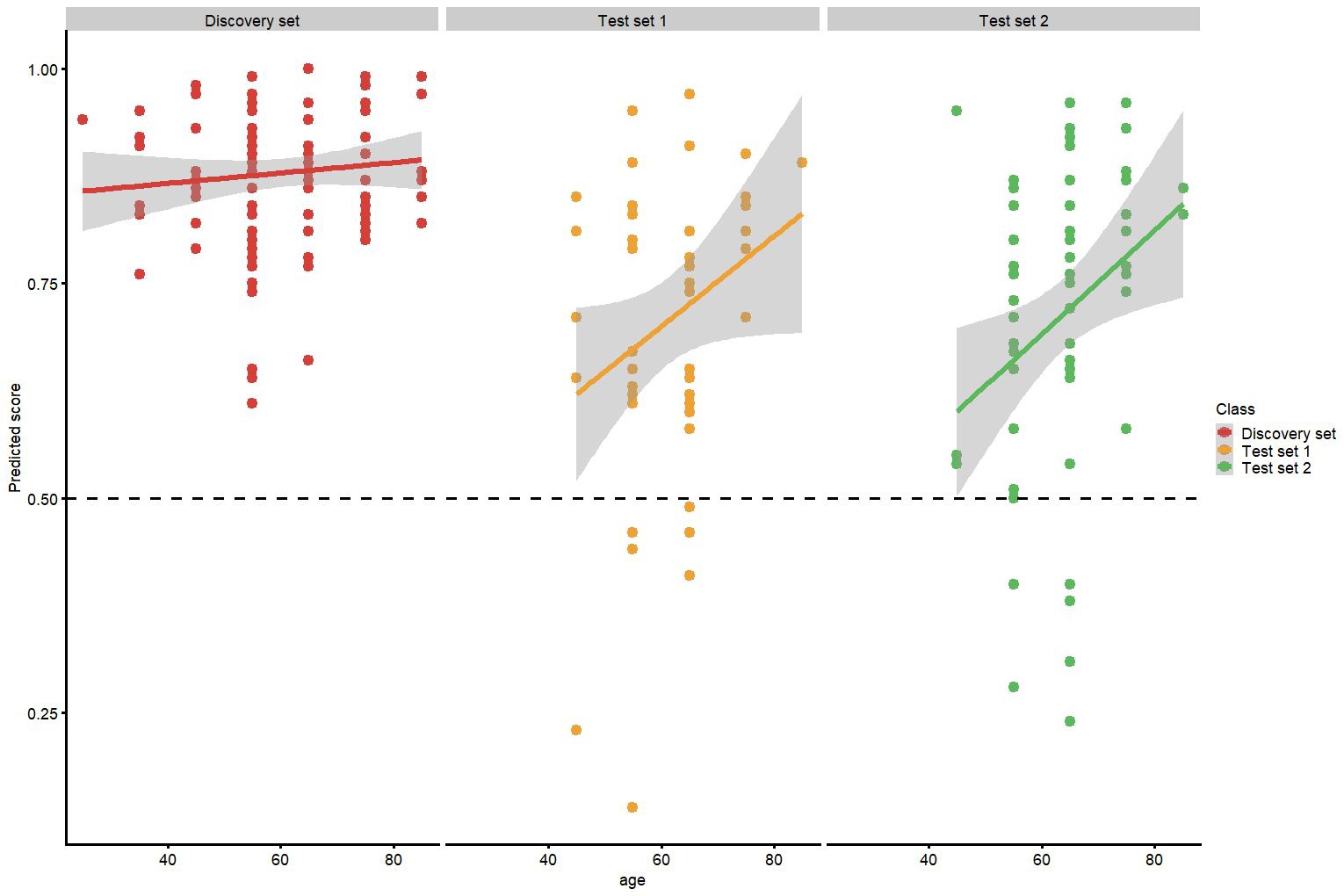 All data are from the suppl. and all data points are cancer patients, since I couldn't find age data on any of the controls (NON-GC). A simple test would be to check if the false positives (non-gc predicted to be cancer) are older than the true negatives (non-gc predicted to be non-gc).