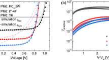 We then blend the acceptors with PM6 to fabricate conventional structured devices. The corresponding absorption and PL spectra of the organic films are shown in Supplementary Fig. 3. εr of the blends with different acceptor ratios are measured in Supplementary Fig. 4. With the increase of T9SBO-F ratio in the acceptor, εr increases from 3.36 (0%), to 3.51 (16.7%), 3.56 (50%), 3.93 (83.3%) and 4.15 (100%). The J–V curves, EQE spectra and the device parameters with different acceptor ratios are listed in Fig. 1e, f, and Table 1, respectively. With the increase of T9SBO-F ratio in the acceptor, the device Voc gradually decreases from 0.888 V (0%), to 0.881 V (16.7%), 0.858 V (50%), 0.837 V (83.3%), and 0.829 V (100%). While increasing the T9SBO-F ratio helps to extend the absorption to near-infrared region, the EQE value keeps decreasing in 650–800 nm, which is ascribed to the increased charge recombination and will be discussed in the next section. Overall, the Jsc gradually increases from 26.0 mA/cm2 (0%), to 27.1 mA/cm2 (16.7%), 27.2 mA/cm2 (50%), 27.8 mA/cm2 (83.3%) and 28.1 mA/cm2 (100%). When blending PM6:L8-BO:T9SBO-F at a ratio of 1:1:0.2, the device presents the highest PCE of 19.0% with a decent FF of 79.6%.