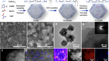 Accelerated durability tests were performed with a sweep rate of 2000 mV/s from 1.0 V to 0.55 V (vs. RHE). Long-term i-t chronoamperometric tests were carried out on an RDE with a rotate speed of 200 r/min at a constant voltammetry of 0.75 V and 0.55 V (vs. RHE) for 50,000 s under alkaline and acidic medium, respectively. A harsh stability test was performed by loading ink of as-prepared catalysts on carbon paper (1 cm−2, Sigracet carbon paper, 28BC) at 0.2 V vs. RHE with high overpotentials for 8 h in 0.1 M KOH under a standard three electrodes system. The Fe loadings and the volume of electrolytes were kept same. Fe loadings were kept at 0.0145 mg cm−2 based on ICP-MS result, and the volume of electrolyte was kept for 20 mL. After the stability test, 8 mL electrolyte were taken out, and 2 mL 1 M H2SO4 were added into the electrolytes to dissolve possible insoluble Fe species. ICP-MS analysis was carried out to determine the Fe contents in electrolytes after durability tests. For comparison, 8 mL of fresh 0.1 M KOH and 2 mL 1 M H2SO4 were also mixed to detect Fe contents of fresh electrolytes.