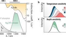 in which \(D\left(\lambda \right)\) is the diffusion coefficient and \({\mu }_{{eff}}\left(\lambda \right)\) is the effective attenuation coefficient of the emissions at 980 and 1550 nm and \(d\) is the measured tissue depth. The luminescence intensities of the two emissions after light propagation were experimentally measured by the NIR-II/III bioimaging and the luminescence intensity ratio was brought into the model so that the temperature can be determined. Detailed derivations and validation of the model were shown in Supplementary Notes 1.