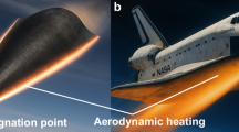 Ultra-high temperature (UHT) and refractory ceramics are a developing class of materials for leading edges due to their stability at high-temperatures14. UHTCs, encompassing carbides, nitrides, and borides of early transition metals (Zr, Hf, Ti, Nb, Ta), possess high melting points (>4000 °C), tunable densities (4.5–12.5 g/cm3), high thermal conductivities >140 W/mK), moderate coefficient of thermal expansion (6.3 to 8.6 × 10−6/K), strong transition-metal-to-non-metal bonding (>600 GPa mechanical stiffness), and high IR spectral emissivity for passive radiative cooling80,81,82. The complexity of multiphase materials and their ability to survive extreme aerodynamic conditions is shown in Figs. 3 and 4. Challenges with respect to oxidation thermal shock can be mitigated through tailoring the architecture and lead to materials that rival metals in leading edge applications (Fig. 3).
