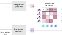 where \(N(T)\) is the set of available wild-type viruses on and before time T, \({b}_{s}\) are the weights for gene s estimated by the VE-GD model for influenza42,43, \({b}_{{HA}}:{b}_{{NA}}=1:3\) for the pH1N1, and 1: 1.8 for the H3N2 (p-value < 0.001). Equation (11) gives the optimal wild-type virus identified by beth-1 for considerations of vaccine strains. For beth-1 (two-protein) model, \(S=\{{HA},{NA}\}\), and for beth-1 (single-protein) model, \(S=\{{HA}\,{or}\,{NA}\}\).