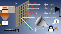 Specific parameters of meta-pillar structures selected in the experiment can be found in Supplementary Note 2. As any polarization can be decomposed into two orthogonal polarization states (RCP and LCP in this study) with different weights32, speckles generated from the DM vary with the polarization of the incident beam. A combination of a half-wave plate (HWP) and a quarter-wave plate (QWP) after the spatial light modulator (SLM) as shown in Fig. 3a is used to alter the polarization of the incident beam. Two specific orthogonal optical channels are defined by the two circular polarization states, i.e., P(1): LCP and P(7): RCP. In addition to these two orthogonal channels, 5 intermediate polarization channels, P(2) to P(6), located between P(1) and P(7), are created by rotating the QWP with an interval of 15°, as shown in the second row in Fig. 2c. Figures in the third row of Fig. 2c shows the recorded speckles corresponding to these 7 incident polarizations. Variation of Pearson correlation coefficient (PCC) of the speckles, taking the speckle of incident LCP as the reference, is illustrated in Fig. 2d. It can be seen that the speckle is highly sensitive to the rotation angle: the PCC gradually decreases from 1 to 0.08. Such a decrease of PCC can significantly impair the recovery efficiency of the input information. Meanwhile, it suggests the independence of each polarization state. It should be noted that only part of the diffused light field needs to be collected due to the complex mapping between the input and output light fields for information decryption33, which further introduces benefits to the enhancement of the spatial security and the information capacity. Scanning electron microscope (SEM) images of the top and perspective views of the DM are shown in Fig. 2e (please refer “Methods” for more details).