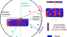 Fitting the GISAXS profile (Fig. 3c) using Eq. 1 without the third term, we can extract the correlation length (ξ) of the amorphous intermixing phase and the size of the crystalline acceptor domain \((2{R}_{{gc}})\). On the other hand, the GISANS profiles can be well fitted by the second and third terms in Eq. 1 due to the highlighting of deuterated acceptors, giving rise to the crystalline acceptor domain sizes (\(2{R}_{{gc}}\)) and the amorphous acceptor domain sizes (\(2{R}_{{ga}}\)). As a result, the GISAXS-fitted ξ and \(2{R}_{{gc}}\) are 49.4 and 19.6 nm, respectively, while the GISANS-fitted \(2{R}_{{gc}}\) and \(2{R}_{{ga}}\) are 29.4 and 10.7 nm, respectively. Remarkably, a new structure feature of Y6 is thereby unveiled, providing the first experimental evidence to the simulation predictions of short-range aggregation of Y6 molecules in the amorphous intermixing phases24. We noted that the crystalline acceptor domain size extracted from X-ray scattering is smaller than that extracted from neutron scattering, which is possibly due to the miscounting of relatively amorphous crystalline domain boundaries by X-rays. In this regard, neutrons are more accurate in extracting the crystalline acceptor domain sizes27. Therefore, we will combine \(2{R}_{{gc}}\) and \(2{R}_{{ga}}\) extracted from GISANS and ξ from GISAXS to compose a comprehensive physical picture of the nanomorphology in the active layer.