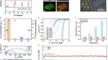 Pinewood-derived carbon (PC) was synthesized by facile pyrolysis of treated pinewood. A digital image, scanning electron microscopy (SEM) images (Supplementary Figs. 1 and 2), pore structure data (Supplementary Fig. 3 and Table 1), and Fourier transform infrared (FTIR) (Supplementary Fig. 4) of PC reflect its properties including lightweight, free-standing, highly porous, and rich in functional groups, etc. A CoNi precursor (Supplementary Fig. 5) with nanoneedle array morphological features was in situ hydrothermally created on the PC, which was subjected to a topotactic phosphidation step to obtain binder-free NiCoP decorated PC (denoted as NCP/PC). Besides, similar procedures were adopted to prepare monometallic phosphide samples, i.e., CoP/PC and Ni2P/PC (Supplementary Fig. 6), as the contrast cathodes. The reasons for introducing such metal phosphides as catalytic materials on PC for subsequent eASR/eNSR experimental demonstrations are briefly described in Supplementary Note 1. The comprehensive structure/composition characterizations of the representative NCP/PC were performed. The crystal nature of NCP/PC was studied by X-ray diffraction (XRD) analysis (Fig. 1a), and four notable reflection peaks at 40.9°, 44.8°, 47.4°, and 54.2° belonging to (111), (201), (210), (300) planes of hexagonal NCP (JCPDS 001-5135) can be observed, except for carbon peaks at ~23° and ~40° from the PC. For the carbonized skeleton of PC, its top surface exhibits a high density of clearly defined, aligned micro-channels, with a clean and relatively flat surface (Figs. 1b–d). Growth of homogeneously/densely distributed nanostructured NCP on PC in both parallel and vertical directions of the channels is visible in the SEM images (Figs. 1e–g) without clogging open micro-channel systems of PC that resemble honeycombs. Consequently, walls of the honeycomb skeleton with NCP (Fig. 1f) do thicken by about a few micrometers, suggesting ~1.95 μm in an average length of the NCP. Moreover, PC alone shows an unsmooth and bare vertical cutting surfaces with shallow and elongated grooves (Fig. 1h, i), whereas a substantial number of needle-like NCP nanostructures are present on the vertical cutting surfaces of the NCP/PC (Fig. 1j, k). Thus, uniformly and densely distributed NCP as reaction sites nicely encircles the entire carbon skeleton, according to SEM characterizations for NCP/PC. Transmission electron microscopy (TEM) image once more supports the nanoneedle-like structures of NCP (Supplementary Fig. 7), and the related high-resolution TEM (HRTEM) images display lattice spacing of 0.262 nm (Fig. 1l) and 0.232 nm (Fig. 1m), which is specific to (210) and (111) planes of NCP, respectively. Moreover, SEM and energy-dispersive X-ray (EDX) mapping of NCP/PC (Fig. 1n) show the even distributions of Ni, Co, P, O, and C across the entire open channels, implying an oxidized surfaces and highly dispersed NCP on PC. Note that the NCP/PC also contains trace elemental N from the PC (Supplementary Fig. 8). The surface chemical states for NCP/PC were unveiled by X-ray photoelectron spectroscopy (XPS, see wide energy range data in Supplementary Fig. 9). Deconvoluted Ni 2p3/2 peaks (Fig. 1o) imply the presence of partially charged Niδ+ species as well as Ni-oxidized states (Ni3+ and Ni2+)54,55,56. Similarly, deconvoluted Co 2p3/2 peaks (Fig. 1p) are assignable to Coδ+ in NiCoP and oxidized Co species having positive states (Co3+ and Co2+)57,58,59. Superficial oxidation of the NCP/PC results in the strong signal of phosphate species (i.e., P5+, P − O) and the weak signals of P 2p3/2 and P 2p3/2 (i.e., Pδ−, Co−P, Ni−P) in the P 2p spectrum (Fig. 1q)60. Such observation is in line with the two dominant peaks occurring in the O 1 s spectrum (Fig. 1r)61,62, which may represent oxidized phosphate species (O1) and surface-adsorbed oxygen species (O2). The mechanical properties of NCP/PC and PC were further evaluated using three-point bending tests, with strains at failure in the 1.37-to-1.6% range, a higher flexural strength value for PC and a higher flexural modulus for NCP/PC (Supplementary Fig. 10). Besides, a piece of NCP/PC can bear the strain of a 200-g weight pulling on it (Supplementary Fig. 11). Furthermore, NCP/PC has a higher conductivity than bare PC (0.03153 KS cm−1 versus 0.0019 KS cm−1), according to data of the four-probe conductivity tests (Supplementary Fig. 12).