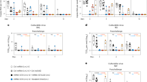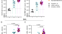 The schedule for the macaque experiment is shown in Fig. 1A. On indicated days, nasopharyngeal swabs (NS) and tracheal lavages (TL) were performed to evaluate vaccine virus replication. NS were collected using cotton-tipped applicators, placed in 2 ml Leibovitz (L-15) medium with 1x sucrose phosphate (SP) as stabilizer and vortexed for 10 s. TL were mixed 1:1 with L-15 medium containing 2x SP. Nasal washes (NW) for analysis of mucosal antibodies in the UA were performed on indicated days (Fig. 1A) using 1 ml of Lactated Ringer’s solution per nostril. Aliquots of all samples were snap-frozen in dry ice and stored at −80 °C. Blood was collected on days −3, 9, 14, 21, 25 or 28 after the prime and on days 37, 42, 49 and 56 from the macaques that received the MPV/S-2P boost dose for analysis of serum antibodies and/or peripheral blood mononuclear cells (PBMCs). Bronchoalveolar lavages (BAL) were performed for analysis of mucosal antibodies and mononuclear cells in the LA.
