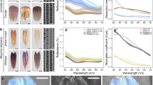 Correlation function analysis of the X-ray nano-tomography measured scales indicates a greater crossrib spacing in the black scale compared to the iridescent scale (iridescent 0.483 μm; non-iridescent 0.607 μm)(Supplementary Fig. 1)38. An expanded crossrib spacing in black scales likely allows more light to enter the scale and so be absorbed by melanin pigments39.