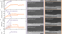 A corresponding decrease in the characteristic decay length is observed (Fig. 2D), following the expected trend relative to the bulk hardness26. The dislocation density in the lattice of a material is inversely proportional to the measured decay length27,28 meaning we expect the stored lattice dislocation density to be multiple times greater for the 5, 10 and 20% alloys, than for pure lithium. This may lead to less voiding, caused by the aggregation of vacancies introduced during stripping at the electrode∣solid electrolyte interface3, with a higher rate of excess vacancy absorption by dislocation climb. Improved contact retention has been observed by several works on the lithium-magnesium system16,20,29. On indenter tip retraction, significant adhesion was observed for all indents, with a similar magnitude of force required to un-stick the indenter tip from each alloy as was needed to indent the sample. The mean pull-off stress (retraction force/contact area) as a function of magnesium content is plotted in Fig. 2E. An example load-displacement graph is shown in the inset of Fig. 2F. There is a clear increase in pull-off stress with magnesium content. A numerical solution to calculate work of adhesion for Berkovich indentation with extensive plastic deformation is yet to be found30, but considering a purely elastic assumption given by the Kendall model (\({P}_{off}=\sqrt{8{A}_{c}M{W}_{ad}R}\), \(R=\sqrt{{A}_{c}/\pi }\)), gives work of adhesion values of 9.61 ± 0.03 mJ m−2 for pure lithium and 15.00 ± 0.57, 26.71 ± 0.56 and 24.45 ± 0.34 mJ m−2 for the 5, 10 and 20 % alloys respectively. Recent works have suggested higher electrode-electrolyte adhesion leads to lower stack pressures being needed to prevent interfacial voiding on electrochemical stripping31. The ratio of peak indent load (Pmax) and the retractive load required to overcome tip adhesion (Poff) is plotted in Fig. 2F. There is a substantial decrease in this relative strength of adhesion with higher magnesium content. This is a result of the increased hardness with higher magnesium content. This lower effective adhesion makes the alloys easier to work with; it can be rolled thinner before rolling defects are observed, and it does not adhere to tweezers when handled.