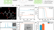 Scanning electron microscope (SEM) image clearly shows the presence of grain boundaries in the compressed HOF-SXU-8 pellet. The morphology of the HOF crystals varies, with well-defined edges and grain boundaries clearly seen in Fig. 2e. While for HOF-g, the grain boundaries disappear and the whole material exists in homogeneous form (Fig. 2f). Optical photography is an effective way to observe changes in samples during heat treatment, thus allowing observation of processes like melting51,57. HOF-SXU-8 pellet exhibited different degrees of transparency after processed at different temperatures. In Fig. 2g, where the sample is placed on the upper side of a printed “X”. The “X” is only visible after treated the pellet at 110 °C for 2 h and then cooled. Combining the results of the TG analyses, it is clear that the change in transparency is due to the occurrence of vitrification.