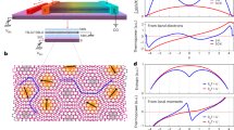 When νtot = 0, MLG and MATBG have equal and opposite filling, and Rxx approaches different values depending on the number of counter-propagating edge states (Fig. 2c). At D = 0, each subsystem is in an insulating, ν = 0 symmetry-broken state. Here, no bulk conduction or edge modes are anticipated, and we observe a large resistance. Near ∣D∣ ≈ 0.05 V/nm, νMLG/νMATBG = ± 1/∓1, and Rxx reaches a minimum near h/2e2 (Fig. 2c). This phenomenology can be explained by a pair of counter-propagating edge modes with opposite spins, analogous to helical edge modes observed in large-angle twisted bilayer graphene2. This interpretation is further corroborated by similar behavior in another contact pair (Supplementary Note 4), and measurements of non-local resistance RNL (Fig. 2d). Indeed, the pronounced non-local resistance signal at νMLG/νMATBG = ± 1/∓1 indicates that transport is dominated by edge modes (see Supplementary Note 5 for a discussion of bulk effects). This is corroborated by the value of RNL, which is suppressed toward h/5e2, the quantized value predicted from the Landauer–Büttiker formula for counter-propagating edge states in this contact configuration (Supplementary Note 3). We therefore conclude that similar to MLG, MATBG has a filled spin down (up) electron- (hole-)like LL at νMATBG = 1(−1).