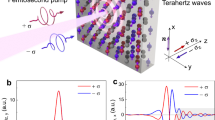 A commercial Ti:sapphire laser (central wavelength of 800 nm, pulse duration of 100 fs, repetition rate of 1 kHz) was used for THz emission measurements. The pumping laser beam was split into two parts (at a 9:1 ratio of intensities) for photogenerating and electro-optic sampling of the THz spin currents. The pumping laser pulses were focused onto the emission samples with a pot diameter of around 3 mm. The laser fluence was 12 μJ mm−2 for most of the measurements. Our measurements were obtained with linearly polarized laser pulses, and the emitted THz wave was collected and refocused by two parabolic mirrors with a reflected focal length of 5 cm. The THz electric field was temporally probed by measuring the ellipticity modulation of the probe beam in a 1-mm-thick (110)-oriented ZnTe crystal. All of the measurements were conducted at room temperature with dry air.