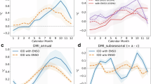where \({\tau }_{x,y,m}\) is the partial regression coefficient of \({T}_{x,y,m}\). \({R}_{{TI}}\) and \({R}_{{TE}}\) refer to correlation coefficients of \({T}_{x,y,m}\) with the IOD and with the ENSO index, respectively. \({R}_{{EI}}\) is the correlation coefficient between the IOD and the ENSO index. \({\theta }_{T}\) is the standard deviation of \({T}_{x,y,m}\) and \({\theta }_{{I|E}}\) is the standard deviation of the IOD index after linearly removing the ENSO influence. The same calculation is conducted for \({P}_{x,y,m}\) to obtain its partial regression coefficient \({\rho }_{x,y,m}\). The effectiveness of this approach is tested by applying to grid-point SST; a partial regression coefficient between grid-point SST anomalies after removing ENSO and the IOD index shows no ENSO pattern in the equatorial eastern Pacific (Supplementary Fig. S1).