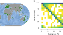 Data for the North American continental analysis came from the US Forest Service’s Forest Inventory and Analysis database v.9 (FIA)32. To eliminate the effects of management, we excluded plantations and actively managed or harvested forest plots from the analysis. To reduce the effects of small plots (plots with few trees are more likely to have only one leaf phenology type), we only included plots with at least ten individual trees. We also excluded plots where >50% of trees had died between census intervals30 to exclude effects of major pest outbreaks or other disturbances. We assigned all observed trees as evergreen or deciduous based on species-level or genus-level leaf phenology data from the TRY database34. We only kept plots for which information on leaf phenology strategy was available for > 90% of trees (weighted by basal area). Our final FIA dataset included 45,276 unique forest sites, each with ~5-yr census intervals (the average time period for these observations is 2010 ~ 2015), along with information on environmental covariates.