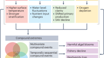 An increase in the frequency of bivariate and multivariate extremes in lakes can be driven by several factors. For example, the frequency of concurrent algal blooms and lake heatwaves can increase due to changes in external drivers (e.g., fertilizer use and climatic warming), or they can also arise when the driver of one extreme, such as anomalously hot surface water temperature causing a lake heatwave, also cause other relevant changes, such as an algal bloom due to the temperature dependence of algal growth40,41,42. However, it is also important to note that a synchronous increase in the frequency of the univariate extreme events may not always occur, as one extreme could, in fact, suppress the occurrence of another. For example, previous studies have shown that higher lake surface temperatures that can lead to a lake heatwave often also result in stronger thermal stratification and, in turn, a reduced supply of nutrient rich bottom waters to the near-surface layer, leading to nutrient limitation at the surface and thus reduced phytoplankton growth43,44,45.