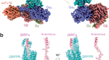 For the structural study, we used an N-terminally truncated form of QRFP, known as QRFP26 (Fig. 1a). QRFP26 is also found in vivo and possesses agonist activity comparable to that of QRFP437,8,15. In this study, we focused on the structural analysis complexed with Gq. To facilitate expression and purification, we truncated the C-terminal residues after G366 of human GPR103. The truncated mutant activated Gq to the same extent as the wild-type in the TGFα shedding assay16 (Supplementary Fig. 1a–d and Supplementary Table 1). We used a mini-Gαq (mini-Gsqi), an engineered mini-Gαs protein whose N-terminal and C-terminal residues are replaced by Gαi1 and Gαq, respectively17. To efficiently purify the stable GPCR–G-protein complex, the receptor, and mini-Gsqi were incorporated in a ‘Fusion-G system’ by combining two complex stabilization techniques18,19 (Supplementary Fig. 2a, b). The modified receptor and G-protein were co-expressed in HEK293 cells and purified by FLAG affinity chromatography. After an incubation with Nb35 and scFv16 that bind to mini-Gsqi, the complex was purified by size-exclusion chromatography (Supplementary Fig. 2c, d). The structure of the purified complex was determined by single-particle cryo-EM analysis with an overall resolution of 3.19 Å (Supplementary Fig. 3, Supplementary Table 2, and “Methods”). As the extracellular portion of the receptor was poorly resolved, we performed receptor-focused refinement, yielding a density map with a nominal resolution of 3.29 Å, which was combined with the overall refined map. The resulting composite map allowed us to precisely build the atomic model of all the components, including the receptor (residues 3–243 and 263–346), QRFP26 (residues 3–26), G-proteins, and antibodies (Fig. 1b, c).
