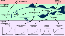 Our data supports a modified consolidated energy acquisition theory for warming induced size reductions in fishes. It is undoubtedly true that in order to survive at elevated temperatures a species must possess adequate aerobic surplus to fuel critical functions such as swimming, digestion, and reproduction21,34. As such, we lean on the theoretical underpinnings of both GOL and MASROS to state the first essential tenet of survival is to “Protect Aerobic Scope” (PAS; see also Jutfelt et al.34, for similar conclusions). For species that overcome the PAS hurdle, either through existing species-wide capacity or population-level adaptation, the greater absolute energy acquisition required by larger individuals may quickly become a secondary hindrance for fitness and survival. Many aquatic ecosystems are expected to become less, not more, productive in warmer oceans126,127,128 and the per-capita ability of organisms to capture, process and assimilate adequate food are therefore likely to decline at elevated temperatures129,130,131. Ecological metabolic theory and resource limitation theory both suggest that unless energetic demand is met with adequate resource acquisition, then growth, development, and survival will be compromised as diminished resources are necessarily reallocated to fitness enhancing processes such as reproduction107,132. Such patterns have been seen in a myriad of organisms ranging from plants and insects to ectothermic and endothermic vertebrates107,132,133,134, including recent direct experimental evidence98. However, theoretically this temperature-driven increased demand for resources could equally be counteracted by reducing the per-capita energetic demand to match the natural upper limit to energy acquisition for a given species.