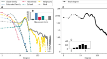 We compare this observed network with theoretical models within the broader landscape of network topologies, such as the random51, small-world30, and scale-free26 types (Supplementary Table 2 and Supplementary Fig. 2). Compared to a random network, which has a lower clustering coefficient and a shorter average path length, our network shows a degree of clustering indicative of a more structured, possibly hierarchical arrangement. Although the average path length and local clustering are closer to that observed in small-world networks, the degree distribution does not align with the uniformity seen in such models, nor does it fit the hub-and-spoke configuration typical of scale-free networks. These observations suggest that our observed network may exhibit a community structure with a quasi-small-world configuration, where a small share of social ties could play a role in enhancing overall connectivity and functionality30.