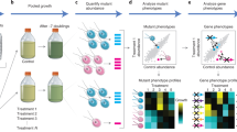 Library maintenance, pooling, competitive growth, DNA extraction, barcode amplification, and library preparation were performed as described41. To identify mutants with growth defects or enhancements due to a specific treatment, we compared the abundance of each mutant after growth under the treatment condition to its abundance after growth under a control condition. A minimum number of 50 reads was required for the phenotype to be calculated. PRO and MAPKK genes are small genes that did not reach the threshold required for the high confidence list, which required at least 3 mutant alleles with a growth defect. The mutant phenotypes of PRF and MAPKK were identified during the initial screens of the mutant library only based on mutant growth rate of single mutants (see Supplementary Fig. 6 for growth data). For each mutant allele contingency table of the phenotypes [Φ < 0.0625, 0.0625 ≤ Φ < 0.125, 0.125 ≤ Φ < 0.25, 0.25 ≤ Φ < 0.5, 0.5 ≤ Φ < 2.0, 2.0 ≤ Φ < 4.0, 4.0 ≤ Φ < 8.0, 8.0 ≤ Φ < 16.0]. High confidence hits were identified based on the phenotype of multiple mutant alleles of each gene. For high confidence genes, we generated a contingency table of the phenotypes, Φ, by counting the number of alleles that met the following thresholds: [Φ < 0.0625, 0.0625 ≤ Φ < 0.125, 0.125 ≤ Φ < 0.25, 0.25 ≤ Φ < 0.5, 0.5 ≤ Φ < 2.0, 2.0 ≤ Φ < 4.0, 4.0 ≤ Φ < 8.0, 8.0 ≤ Φ < 16.0]. A p value was generated for each gene by using Fisher’s exact test to compare a gene’s phenotype contingency table to a phenotype contingency table for all insertions in the screen.