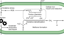 Substantial CH4 production during the light period was observed with PCC6803-M. b-Fe-EDTA (Fig. 2b). However, deletional control experiment revealed that PCC6803 produced almost no CH4 under illumination without the presence of other factors (Supplementary Fig. 3), suggesting the potential existence of an abiotic CH4 production process. ROS are vital cellular metabolic products found in all living organisms. They are responsible for oxidizing the methyl groups (-CH3) of methyl donors and can play a crucial role in modulating chemical CH4 formation (Fig. 5a). Electron paramagnetic resonance (EPR) spectra revealed clear signals of 5,5-dimethyl-1-pyrroline-N-oxide (DMPO)/•OH, DMPO/superoxide anion radicals (•O2-) and 2,2,6,6-tetramethylpiperidine-1-oxyl (TEMPO)/1O2 from PCC6803-M. b-Fe-EDTA (Fig. 5b, Supplementary Fig. 12). In addition, H2O2 was produced as shown in the ultraviolet–visible (UV–Vis) absorption spectra (Fig. 5c). The concentrations of these ROS, particularly •OH and H2O2, significantly increased under light illumination (Fig. 5d), likely attributed to the produced O2 by PCC6803 during the photosynthetic oxygen evolution that significantly stimulated the ROS production by M. b. This inference was confirmed through the ROS production experiments with M. b under varying O2 concentrations. It was found that higher O2 concentrations led to the production of more ROS, such as •OH and H2O2 (Supplementary Fig. 13). Stable isotope analysis with 18O2 further confirmed that the produced ROS stemmed from O2 reduction, evidenced by the observed 5,5-dimethyl-1-pyrroline-N-oxide (DMPO)-18OH (m/z = 132.09, Supplementary Fig. 14). Previous studies have shown that when anaerobic cells were exposed to oxygen-rich environments, molecular O2 adventitiously abstracted electrons from the reduced flavins or metal centers of some redox enzymes, resulting in the ROS formation (O2 → •O2- → H2O2 → •OH)39,40,41. As these events relied on collision frequency, the ROS production rate was directly proportional to the O2 concentration42. Subsequently, the produced ROS were inadvertently released extracellularly43. Meanwhile, ROS could also be produced by PCC6803 during the photochemical energy conversion for bioenergetic production44. These ROS could be further used for -CH3 and Fe(II) oxidization. Particularly, the light-driven H2O2 may also interact with EDTA chelated-Fe(II) for •OH production via Fenton reaction (Fe(II) + H2O2 → Fe(III) + •OH), leading to an increasing Fe(III) concentration under illumination in the first light-dark cycle (Fig. 5e). The produced Fe(III) through the oxidation of ROS and O2 could be reduced by PCC6803 (Supplementary Fig. 15), either through intracellular metabolism or extracellular electron transfer, and finally established an effective Fe(III)/Fe(II) redox cycle.