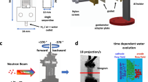 Neutron radiography experiments were performed at the NEUTRA thermal neutron and ICON cold neutron imaging beamlines at the Spallation Neutron Source (SINQ) facility of the Paul Scherrer Institute, Switzerland. In the SINQ facility, the neutrons were ejected from a lead spallation target that was hit with a proton beam at 590 MeV energy with 1.5 mA proton current. The ejected neutrons were moderated by heavy water and reached thermal velocities (with a mean energy of 25 meV)62. For the NEUTRA beamline, attenuated neutrons were captured by a scintillator screen (10 μm thick, Gd2O2S:Tb) and converted to visible light, which is subsequently captured by the charge-coupled device camera detector at an exposure time of 30 s. A tilted detector setup was used at the NEUTRA beamline that enables stretching in the horizontal transverse direction (with respect to the beam trajectory), see Fig. 1a, meaning that the membrane-electrode assembly can be imaged with higher spatial resolution63. The resulting pixel size in the direction across the membrane was 6 µm and the effective resolution, taking into account the blurring intrinsic to the detector and due to the beam divergence, was approximately 20 µm.