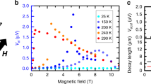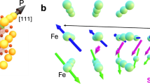 Within the \([1\bar{1}0]\) device, illustrated in Fig. 4, we note that the \([1\bar{1}0]\) ([110]) devices have a lower magnitude with a positive (or negative) offset. The sign of the offset is consistent from device to device (5 devices for each orientation), as discussed in Supplementary Note 7, Fig. 29. A finite magnon output in the two devices where the single-domain ferroelectric with one variant spin cycloid is present can be understood from the symmetry of P and k, if we consider that La-substitution can allow for different symmetry operations when switching the polarization18, 38. With an electric field along [110], in the parent BiFeO3, this would result in a C2 rotation about [001], or two successive 71° switches within the (001) Fig. 4b. Moreover, with electrical poling, the ferroelastic domains (71° or 109°) in BiFeO3 remain the same when the net polarization and electric field are parallel, whereas the domains re-orient themselves if the electric field is orthogonal to the polarization in the plane devices38. This leads to the magnon transport in all directions of approximately the same magnitude. Furthermore, the magnon transport anisotropy in the spin cycloid is evident where magnons propagating along k give larger output than its orthogonal direction18 in the case of BiFeO3 having 109°, whereas in BiFeO3 with 71° does not show any anisotropy due to its zig-zag spin cycloid pattern. In the case of La-substituted BiFeO3, the ferroelectric domain becomes a single domain after electrical poling (the unpoled pristine state does not favor magnon transport, as noted in Supplementary Information Note 7, Fig. 27), providing a key degree of freedom to choose a single variant, free from ferroelastic domain wall scattering in the magnon transport. As noted above in the case of BiFeO3, k is rotated about the [001], to which it is orthogonal, resulting in k → − k. In the case of La-substituted BiFeO3, however, the polarization along [112] may allow for this rotation to happen about the \([1\bar{1}0]\) or \([\bar{1}10]\) direction, rather than about the film normal (Fig. 4c, d). This operation, for example from [112] to \([1\bar{1}2]\) is only a ∼ 70° rotation of P, rather than the two 71° events to rotate around [001]. In addition, the rotation axis in this scheme is parallel to k, which then does not change sense after the operation. We would expect this to result in a small magnon signal, as observed. From the controlled experiments of the magnon transport through multi-domain versus single-domain state (Supplementary Note 7, Fig. 27), it is suggested that the uniform spin cycloid is responsible for finite magnon output in a single-domain multiferroic. Furthermore, the orientation of the spin cycloid’s propagation vector decides the inverse spin Hall voltage output’s magnitude. This indicates that the anisotropic nature of magnon transport as is intricately linked to the spin cycloid and, thus, the polarization of the Bi0.85La0.15FeO3.
