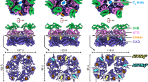 CpaFAPO formed a C2 symmetric hexamer with subunits arranged in an open, closed and open’ conformation like CpaFAMPPNP and CpaFADP (Supplementary Fig. 7A). No nucleotide or Mg2+ was observed in the nucleotide-binding pockets (Supplementary Fig. 7B) although HEPES was bound in the CTD/CTDn+1 clefts in both open and open’ state subunits. Superposition of the three distinct NTD2/CTDn+1 units within the CpaFAPO hexamer showed close alignment with RMSD Cα \(\le\) 0.7 Å (Supplementary Fig. 7C). However, comparison of the CpaFAPO and CpaFADP asymmetric units showed that whilst similar, they do not pack identically and cannot be considered equivalent to CpaFADP superposed on CpaFAMPPNP. Specifically, Hinge 2 within the open state subunit is straightened so that its NTD2 moves towards the neighbouring NTD2 of the closed subunit (Fig. 3C). Consequently, the nucleotide-binding pocket in the open state subunit differs significantly in comparison to CpaFAMPPNP and CpaFADP as the associated NTD2/CTDn+1 unit has rotated (Supplementary Fig. 7B). The overall effect is a relaxed and more rounded C2 symmetric hexamer. CpaFAPO is therefore consistent with a model where CpaF preferentially assembles as a C2 symmetric hexamer irrespective of nucleotide state. Critically though, nucleotide binding accentuates the oval-shaped C2 symmetry observed in CpaFAMPPNP and CpaFADP hexamers and switches the conformation of the open state nucleotide binding pocket, with this form likely to be prevalent in vivo given the high nucleotide concentration in the cell.