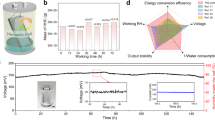 Comparing the electrical output of devices featuring distinct compositions (Fig. 2d, Supplementary Fig. 7), it is obvious that the PA and LiCl synergistically enhances the electrical output. Upon adding LiCl and PA individually, there is an improvement in the voltage output. However, the PVA-PA-LiCl hydrogel exhibits a remarkable increase in both voltage and current. Concretely, PA provides massive migratory ions, resulting in effective charge separation and an increase in voltage output17. The introduction of LiCl contributes to elevating the ionic transport rate43, prompting an obvious increase in current density. Additionally, LiCl significantly enhances the moisture sorption capacity of the hydrogel (Supplementary Fig. 8), enabling it to rapidly establish gradients of water content and ion concentration.