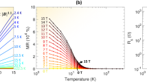 where ne(nh) and μe(μh) are the carrier density and mobility of electrons (holes), respectively. The mobilities of electron-type and hole-type are assumed to be equal at low temperatures, as both of them are quasi-particle excitations around the Dirac points, which have similar scattering mechanisms. The fitting result can be seen in Fig. 2c. The electron (hole) carrier concentration is found to be ne = 2.07 × 1019 cm−3 (nh = 1.93 × 1019 cm−3) at 2 K, with a net electron carrier concentration δne=1.4 × 1018 cm−3. The corresponding mobility exhibits a high value μ(e, h) = 3 × 106 cm2 V−1 s−1. This value is close to that of the Weyl semimetal NbP (5 × 106 cm2 V−1 s−1)16. The quantum oscillation behavior maybe qualitatively understood from the low-energy band structures of the bulk twisted intertwined GS. Away from the central dislocation core, the system can be viewed as numerous layers of TBG, which are coupled via nearest neighbor interlayer hopping. As a result, such bulk moiré superlattice is bestowed an additional vertical wavevector (kz) degree of freedom. When the twist angle is relatively large (≥ 3°), the low-energy band structure consists of Dirac cones in the kx-ky plane, with kz-renormalized Fermi velocities, as shown in Fig. 2d. Neglecting the frame-rotation effects of the two graphene layers, it turns out that the low-energy states of the system have an approximate particle-hole symmetry at each vertical wavevector kz. Consequently, the Dirac point at each kz is pinned to the same energy by virtue of this particle-hole symmetry. Including the frame-rotation effects would shift the energy of the Dirac point, leading to a kz dispersion of the form 4γ0cos2kzd063, with γ0 ~ 3.5 meV, leading to a kz dispersion of Dirac points ~ 7 meV. This may lead to the co-existence of electron and hole carriers even when the system is charge-neutral. Moreover, other effects, such as the variation of the interlayer distance (from 3.35 angstrom to 3.50 angstrom according to the TEM measurements) and remote-band renormalization effects may further enhance the kz dispersion of the Dirac points, which qualitatively explains the co-existing electron- and hole-type carriers in the system. As a two-band system with similar carrier concentration between electrons and holes, the compensation mechanism can be a major factor. Considering the effect of topological Landau levels on MR, we measured R(T) curves under different magnetic fields.