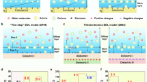Based on the above experiments, EDL models were developed for various solid-liquid contact interfaces. Firstly, the EDL for the dielectric surface followed the two-step model (Fig. 2f). Secondly, weaker reverse electrical signals from falling droplets indicated reversed charge distribution and lower density in the EDL for the pure metal surface (Fig. 2g). Due to high hydration-free energy, cations couldn’t directly adsorb onto the solid surface27, forming an IHP with the water molecule dipole layer while hydrated cations constituted the OHP. Thirdly, when DI water contacted the sputtered metal charge-collecting layer of the dielectric substrate, the EDL could form through microscopic cracks (Fig. 2h). Its charge distribution resembled that of the EDL from the dielectric surface, with intermediate charge density compared to the dielectric and pure metal surfaces. While pure dielectric could form the EDL, they cannot directly transfer charges due to insulation. Conversely, although pure Au exhibited excellent conductivity, the minimal triboelectric charge in the EDL limited the ion concentration gradient, resulting in a weak electrical signal. Only the dielectric substrate with a sputtered metal layer could ensure that PDC-TING produces effective ion flux, utilizing the distinct advantages conferred by the formation of cracks in the metal sputtering layer. These cracks serve as conduits for liquid infiltration, thereby leveraging the solid-liquid CE properties of the dielectric layer. This enhances charge storage and transfer efficiency. In addition, the cracks facilitate efficient current collection, reducing resistance and improving charge transport within the material. This combined effect enhances the performance of the hybrid material, enabling applications with high power density and rapid charge/discharge rates while offering versatile and innovative solutions across diverse domains. The function of the charge-collecting layer in the combined effect is similar to the role of graphene in hydrovoltaic technology8,28,29. However, the chemical vapor deposition (CVD) method demands stringent environmental conditions and intricate processes for the preparation of graphene, etc. In contrast, the magnetron sputtering of metal charge collectors does not require high temperatures or precise atmosphere control as the physical vapor deposition (PVD) method, facilitating large-area deposition. It provides a cost-effective and versatile means to adjust material properties by altering metal coverage on dielectric substrates. This technique enables the creation of a tunable ionic-electronic coupling interface, facilitating in-depth studies of iontronics.