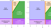 An individual’s strategy specifies its probability PL of playing Hawk as a leader and its probability PF of playing Hawk as a follower (so that it plays Dove with probability \(1-{P}_{L}\) as a leader or \(1-{P}_{F}\) as a follower). These individual choices are combined into a single collective decision, whereby the entire group either plays Hawk, with probability P, given in Eq. 1, or Dove, with probability \(1-P\). However, all individuals do not necessarily exert equal influence on this outcome. The leaders’ combined influence on P is proportional to PLε, while the followers’ combined influence is proportional to \({P}_{F}\varOmega \left(1-\varepsilon \right)\), where 0 ≤ Ω ≤ 1. \({\bar{P}}_{L}\) and \({\bar{P}}_{F}\) correspond to the mean leader and follower strategy within each group respectively. When \(\varOmega=0\), follower strategies are weighted by zero, so only the leaders have influence, and the decision-making structure can be described as an unshared consensus decision46. In contrast, when \(\varOmega=1\), any given follower and any given leader both have an equal share of influence, and the decision-making structure can be described as a shared consensus decision46. Note, our model assumes that once a collective decision is made, the whole group abides by the decision. Thus, our model is applicable to societies where the possible benefits of defection are outweighed by the costs of punishment47,48, isolation from the group49,50, or delays in decision-making51.
