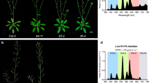 To study how rice seedlings physiologically respond to UV-B light signals, we designed an experimental system to analyze the effects of non-damaging UV-B light on rice seedling development. We grew rice seedlings under short-day conditions (10-h light/14-h dark photoperiod) in white light alone (WL) or WL supplemented with 15 μW cm−2 (equivalent to ~2.25 μmol m−2 s−1) narrowband UV-B light (WL + UV-B) during the daytime. Under these conditions, 10-day-old seedlings for the two wild-type (WT) cultivars, Dongjin (DJ), and Nipponbare (Nip), were shorter in stature, with shorter first and second leaf sheaths, when grown under WL + UV-B compared to WL (Supplementary Fig. 1a–c). At the same time, stem thickness increased under WL + UV-B relative to WL (Supplementary Fig. 1a, d, e). These results demonstrate that low-level UV-B light promotes the development of a compact seedling architecture in rice.