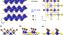A close look into the evolution of the intralayer exchange coupling (\({J}_{1-7}\)) across the four structures (S1–4) provides further insights into the two identified factors for the enhanced \({T}_{{{\rm{CW}}}}\). The calculated \({J}_{1-3}\) show noticeable variations for S1 – 4, for a wide range of U, as shown in Fig. 6c–e, whereas \({J}_{4-7}\) remain unchanged across S1 – 4 structures (see Supplementary Note 12). For the first factor, the absence of neighboring layers leads to a substantial increase in both \({J}_{1}\) and \({J}_{2}\), i.e., \({\Delta }_{{{\rm{S}}}1\longrightarrow {{\rm{S}}}2}=\sim 1{{\rm{K}}}\) shown in Fig. 6c, d. This increase in FM \({J}_{1}\) and \({J}_{2}\) by simply removing the neighboring layers is likely due to the suppression of a hopping path between the in-plane nearest (\({J}_{1}\)) and second nearest (\({J}_{2}\)) neighboring Cr sites going through neighboring layers that contributes an AFM intralayer exchange coupling to \({J}_{1}\) and \({J}_{2}\). For the second factor, the intra-unit cell lattice relaxation results in an increase in \({J}_{2}\) and \({J}_{3}\) by about 1 K and 2 K, respectively, i.e., \({\Delta }_{{{\rm{S}}}2\longrightarrow {{\rm{S}}}3}=\sim 1\) K and \(\sim 2\) K shown in Fig. 6d, e. The enhancement in \({J}_{2}\) is likely to arise from the increase of Cr-S-Cr angle between the two Cr sites within the unit cell (i.e., between the second nearest neighboring Cr sites), whereas the increase for \({J}_{3}\) mainly originates from the decrease of the Cr-S-Cr angle along the b axis (i.e., between the third nearest neighboring Cr sites). The strong dependence of the intralayer exchange coupling on the lattice structure has also been seen in strain-engineered CrSBr52,53,54. We further comment that while our calculations successfully explain the enhanced TN at the surface of 3D CrSBr, they are not intended to, and also cannot, provide the precise values of TN at the surface and inside the bulk of 3D CrSBr to match the experimental ones.