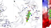 where \( < \ldots { > }_{{PL}}\) indicates ensemble average estimated from molecular dynamics simulation of the protein-ligand complex, GP, GL and GPL are free energies of the protein, the ligand and the protein-ligand complex respectively. The initial 50 ns trajectories where the ligands still stayed bound to ClC-3 were taken from 300 ns simulations for MM/PBSA calculations using gmx_MMPBSA75,76.