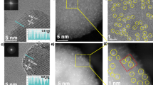 The obtained surfactant crystals were treated with humid ammonia vapor, and almost all lamellae showed structural changes due to the hydrolysis and condensation of metal species, with remaining peaks derived from the packing of alkyl chains. The crystals with Ba2+, Sr2+ and Ca2+ retained their structures because of their stabilities against hydrolysis, even under basic conditions, due to their low electronegativities (χ = 0.89, 0.99 and 1.04) (Supplementary Fig. 14). Although the surfactant crystals containing V3+ and Sn2+ reacted with ammonia vapor treatment, products including ammonium vanadate and tin oxide were obtained, possibly due to their high reactivity to changes in valence to V5+ and Sn4+. Although Bi3+ is a trivalent cation, its high electronegativity (χ = 2.03) allowed a drastic reaction, leading to an apparent polycrystalline metal oxide. In contrast, the surfactant crystals containing other elements did not show obvious peaks derived from any metal hydroxide, oxyhydroxide, oxide, or other related compounds, except cerium species. While the XRD patterns may suggest the presence of crystalline samples, the observed peaks are likely attributable to the packing of alkyl-chains and ammonium sulfate (Supplementary Fig. 15). The metal species generally reacted with OH- groups and formed continuous structures or metalate under strongly basic conditions; however, we assumed that the obtained intermediate probably formed molecular hydroxide for divalent cations and lanthanoid by considering the results of La3+ as a typical example (Supplementary Fig. 16), and we assumed the formation of neutral clusters for Al3+, Sc3+, Cr3, Fe3+, Ga3+, Rh3+ and In3+ due to the results of the gallium species. The interlayer space of the surfactant crystals could act as a unique space considering the chemical statement of the obtained metal species, as some of the intermicellar space exhibited similar phenomena28,29.