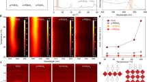 X-ray photoelectron spectroscopy (XPS) is conducted to probe the changes in the elements and their chemical states in lysine, PbI2, and (lysine)2PbI2 (Supplementary Fig. S10). All core-level peaks are assigned to C 1 s, N 1 s, Pb 4 f, and I 3d. The peaks referred to Pb 4 f in (lysine)2PbI2 shift towards lower energy compared to the case of PbI2, which could be attributed to the interaction between lysine and Pb. Similarly, the I 3d peaks exhibit a shift towards lower binding energy, while the peaks of N 1 s exhibit a shift towards higher energy. Meanwhile, Fourier-transform infrared spectroscopy (FTIR) spectra indicate the shift of C = O and the absence of O-H observed in (lysine)2PbI2 (Supplementary Fig. S11). These results indicate that the adjacent amino and carboxyl groups in lysine coordinate with PbI2. The synchrotron X-ray source is further employed to probe the amorphous (lysine)2PbI2 and confirm structure information (Fig. 1e and Supplementary Fig. S12). R-space Extended X-ray Absorption Fine Structure (EXAFS) results confirm the formation of Pb-I, Pb-N, and Pb-O in (lysine)2PbI2 (Fig.1e and Supplementary Fig. S12). In R-space EXAFS data, a strong peak around 2.70 Å is assigned to the Pb-I bond, which is smaller than the distance Pb-I in PbI2 (3.17 Å)26. The peaks centering at 1.11 Å and 1.69 Å could be attributed to the formation of Pb-N/Pb-O27,28. Inspired by the crystal structure of (lysine)2NiCl229, the bond information of Pb-I/Pb-O/Pb-N, and the 6-coordinate of Pb, we firmly verify the structure of amorphous (lysine)2Pbl2 (Fig. 1f). Newly formed (lysine)2PbI2 demonstrates exceptional stability, maintaining its integrity for over 2000 hours without any observable changes (Supplementary Fig. S13).