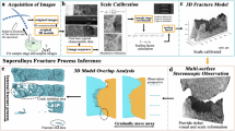 In this work, we propose using the fractal nature of fracture surface topography and their transition to non-self-affine properties31 (where self-affinity means the roughness scales with the observation window) to define a suitable comparison scale. We also aim to develop supporting statistical methods for forensic fracture matching using three-dimensional (3D) topological imaging of fracture surface details. Fracture surface topography exhibits unique characteristics across various length scales, offering significant insights into damage initiation and propagation. The material microstructure controls the micro-mechanisms of fracture and the microscopic crack growth path, while the loading direction determines the macroscopic crack trajectory32. Mandelbrot et al.31 first demonstrated the self-affine nature of fractured surfaces, relating their roughness to the material’s resistance to fracture through the fractal dimension. This self-affine roughness has been experimentally verified for various materials (metals, ceramics, and glasses) and under static and dynamic loading conditions33,34,35,36,37. A key finding is the variation of the surface descriptors when measured parallel to the crack front and along the direction of propagation38. The cut-off length scale of the self-affine behavior has been suggested as a unique scale to characterize the microscale fracture process in ductile34,39,40 and brittle/semi-brittle materials34,41,42. Motivated by observations about the self-affine nature of fracture surfaces, we hypothesize that a randomly propagating crack will exhibit distinctive topographical details when observed from a global coordinate that does not recognize the direction of crack propagation. This work explores the existence of such distinctions at relevant length scales, which implies they can be used to individualize and distinguish paires of fracture surfaces. Our approach leverages the distinctive attributes of microscopic fracture surface features at relevant length scales, arising from the interaction of the propagating crack-tip process-zone and microstructure details, as shown in Fig. 1c. The corresponding surface roughness analysis is shown in Fig. 1d using a height-height correlation function, \(\delta h(\delta {{{\bf{x}}}})=\sqrt{{\langle {[h({{{\bf{x}}}}+\delta {{{\bf{x}}}})-h({{{\bf{x}}}})]}^{2}\rangle }_{{{{\bf{x}}}}}}\), where the 〈 ⋯ 〉 operator denotes averaging over the x-direction. At the small length scale of less than 10–20 μm, the roughness characteristic is self-affine (i.e. proportional to the analysis window scale). However, at larger length scales (>50–70 μm), the roughness characteristic deviates and reaches a saturation level, highlighting the individuality of the surface topography at such scale. The height-height correlation function at this transition scale, as shown in Fig. 1d, captures the uniqueness of the fracture surfaces. We use this transition scale to set the observation scales (i.e., field of view (FOV) and imaging resolution) for comparing matching and non-matching surfaces, and creating a statistical model for classification. This imaging scale should be greater than about 10-times the self-affine transition scale to avert signal aliasing. Multiple observations at different spectral topographical frequency bands (around the transition scale of fracture surface topography) can be combined into one model to improve discrimination between surfaces of the same class or from similar manufacturing processes. This statistical model can produce a likelihood ratio or log-odds ratio for classifying new surface sets, similar to methods used in fingerprint identification and bullet matching43,44,45,46,47,48,49. This model can estimate misclassification probabilities and compare them to actual rates in test data. For example, in fingerprint identification, features (minutiae) on reference and latent prints are marked and scored based on their match, forming part of a probabilistic model that reports a likelihood ratio50. Similarly, the Congruent Matching Cells approach in ballistics divides scanned cartridge breech face surfaces into cells, searches for matches, and uses this input for a statistical model to output a likelihood ratio51,52.