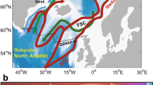 Two different trajectory runs were performed using TRACMASS to identify the water transport routes and to quantify the water mass transformation associated with the Arctic outflow and Atlantic inflow into the eastern SPNA and Nordic seas (Fig. 1a–b). The first simulation deals with trajectories starting in southward direction from Fram Strait (Fig. 1a; Arctic outflow); the second deals with trajectories starting in northward direction from the eastern SPNA section (Fig. 1b; Atlantic inflow). In both simulations trajectories were seeded across all 12 months of the year 1979 and advected forward in time for 43 years, i.e., until 2021 to represent the present-day climate. Note that the original hindcast model data is available from 1958 to 2021 but we discarded the first 21 years to minimize the effect of model drift on the results. Additionally, the JRA55-do atmospheric forcing dataset uses satellite products for bias-correction and thus more realistic 1979 onward49. In the Arctic outflow run, southward flowing water parcels were initiated across Fram Strait (Fig. 1a, red line) through all depths. A volume transport of maximal 1500 m3s−1 was assigned to each trajectory. This implies that when the southward volume transport in a grid box exceeds 1500 m3s−1, the number of water parcels seeded was equal to the volume transport divided by 1500, rounded off upwards to an integer value. Using 1500 m3s−1 as target resolution per water parcel ensures a good Lagrangian resolution55. Similarly, during the Atlantic inflow simulation, northward flowing water parcels were initiated across the whole depth range (Fig. 1b, blue line) with each parcel carrying a volume transport less than 2500 m3s−1. The larger number here is associated with the much larger total transport associated with the Atlantic inflow, keeping the resolution of this flow still very high. A sensitivity test was performed through varying the maximum volume transport by ± 500 m3 s−1 for the two Lagrangian experiments. The results remained unchanged within 1% uncertainty levels. Since NEMO uses a quasi-isotropic grid, the latitude is not fixed along a constant meridional model index. In each of the Lagrangian runs, trajectories were halted when they reached Fram Strait (Fig. 1a-b, red line) or reached the eastern SPNA section (Fig. 1a–b, blue line), or entered the Barents Sea (Fig. 1a–b, orange line). Trajectories exiting through the sea surface (i.e. evaporating) and the trajectories still circulating without reaching any of the ending sections were discarded. A total of 0.02 Sv evaporated and 0.62 Sv is still circulating in the Arctic outflow simulation (Table 1). Conservative temperature (°C), absolute salinity (g kg−1), potential density (kg m−3), and mixed layer depth (m) were stored along the trajectory pathways and at the sidewalls during each grid cell crossing. The conservative temperature, absolute salinity, and mixed layer depth were taken directly from the model monthly mean outputs. The potential density referenced to the surface was computed by using the TEOS-10 equation of state60,61, as in the GO8p7-eORCA12 configuration. The mixed layer depth was computed in the NEMO model using a density criterion62.