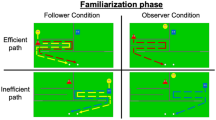 In line with these two broad possibilities, infants in each condition were assigned to one of two subgroups. In one, agent2 opted to engage with agent1 further and responded in kind to her actions (in-kind subgroup). Thus, in the give condition, agent2 helpfully stored agent1’s last decorated paper, and in the steal condition, she tore it up and dropped the pieces on the apparatus floor (Supplementary Fig. 1). Infants in this subgroup thus saw the opposite outcomes from those shown in the give and steal conditions of the inconsistent group in Experiment 2. In the other subgroup, agent2 chose not to engage with agent1 further (no-engagement subgroup). To make clear agent2’s lack of engagement, the experimental setup of the test trial was modified slightly. While agent2 watched, agent1 first decorated two papers with stickers, as usual. However, her last decorated paper, already prepared, now lay across the apparatus, out of her reach but within agent2’s reach22,28; agent1 tried unsuccessfully to grasp it until she was called away by the bell. After she left, in both the give and steal conditions, agent2 picked up the paper, examined it, and then returned it to its original position on the apparatus floor, out of agent1’s reach (Supplementary Fig. 2). Thus, in both conditions, agent2 chose not to engage with agent1 further: not to help her by bringing her paper closer or storing it in the give condition, and not to harm her by stealing or destroying her paper in the steal condition.