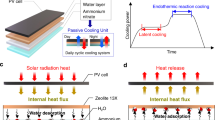 For a deeper reflection on the physical working principle in quasi-steady state, the energy conservation equation for the passive isothermal film during daylight hours is described by Eq. (1). The left-hand term represents the sensible heat change of the film, where m is mass, cp is specific heat capacity, T is temperature, and t is time, respectively. The solar irradiation power (\({\dot{Q}}_{{{{\rm{sun}}}}}\)) is defined by Eq. (2), and the emissivity (ε) and absorptivity are identical in thermal equilibrium based on Kirchhoff’s law of thermal radiation, where A represents surface area, ϴ denotes the angle of incidence, λ stands for the wavelength of electromagnetic waves, and IAM represents solar illumination: