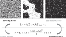The core idea of the Neighbor GWAS method was inspired by the Ising model of ferromagnetism to estimate its interaction coefficient based on the genotypic similarity between neighboring individuals34. In this paragraph, we briefly describe the major points (see pages 2–3 and Fig. 1 in Sato et al. for details34). To recapture the similarity between the Ising model and Neighbor GWAS, we focused on the fixed effects of Eq. 1 without the intercept \({\beta }_{0}\), the random effects \({u}_{i}\) and residuals \({e}_{i}\) as \({y}_{i}={\beta }_{1}{x}_{i}+{\beta }_{2}\left({\sum }_{j=1}^{J}{x}_{i}{x}_{j}\right)/J\). When we sum up the phenotype values for the total number of plants \(n\) and replaced it as \(E=-{\beta }_{2}\), \(H=-{\beta }_{1}\) and \({\epsilon }_{I}=\sum {y}_{i}\), Eq. 1 can be transformed as \({\epsilon }_{I}=-E{\sum }_{ < i,j > }{x}_{j}{x}_{j}-H\sum {x}_{i}\), which represents the interaction energy of the Ising model. The neighbor genotype effect \({\beta }_{2}\) and focal genotypic effect \({\beta }_{1}\) can be interpreted as the energy coefficient \(E\) and the external magnetic effect \(H\), respectively. In this analogy, an individual plant represents a magnet whose north or south dipole corresponds to two homozygotes at each locus. When simulating the spatial arrangement of individual plants, the negative and positive \({\beta }_{2}\) determine whether clustering or mixing patterns decrease the total energy \({\epsilon }_{I}=\sum {y}_{i}\) (Supplementary Fig. 7a, b). The analogy of the Ising model suggests that the different signs of \({\beta }_{2}\) modulate phenotypic values under monoculture or a mixture of the two genotypes at a given locus.