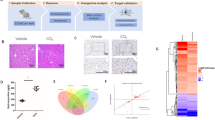 Mice were housed in a room maintained at a temperature of 22 °C and relative humidity of 50 ± 10% with alternating 12 h of light and darkness. Mice were acclimatized for one week prior to use and had free access to food and water during the entire experiment. In the CCl4 groups, mice were intraperitoneally (i.p) injected with 0.3% CCl4 (10 mL/kg, dissolved in corn oil). 64 mice at 8-weeks of age were randomly assigned to two groups: a prevention group and a treatment group. Prevention and treatment groups were divided into subgroups of Oil + DMSO, Oil + FDI-6, Oil + CCl4 and CCl4 + FDI-6. CCl4 was given via i.p. injection three times/week for 3 weeks in prevention group and 5 weeks in the treatment group. FDI-6 was dissolved in 10% DMSO and diluted in 90% corn oil (final concentration: 2.5 mg/mL). FDI-6 treatment was given at 25 mg/kg/d via direct i.p. injection three times/week started at the same time as CCl4 in the prevention group versus after 3 weeks of CCl4 in the treatment group and continued with CCl4 for 2 weeks.