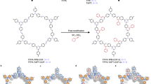 More than 10 g crystalline DBTB-DETH-COF was quickly obtained within 1 h from the condensation of 4,4’-dihydroxy-[1,1’-biphenyl]−3,3’,5,5’-tetracarbaldehyde (DBTB) and 2,5-diethoxyterephthalohydrazide (DETH) under ultrasound conditions as shown in Fig. 1. The as-synthesized DBTB-DETH-COF was characterized by Fourier-transform infrared spectroscopy (FT-IR). The emerging stretching vibration peak at 1620 cm−1 was observed, confirming the formation of a C = N linkage (Supplementary Fig. 1a)31. The solid-state cross-polarization with magic angle spinning (CP/MAS) 13C NMR spectrum exhibited a resonance signal at 150.2 ppm, corresponding to the chemical shift of imine carbon atoms in DBTB-DETH-COF (Supplementary Fig. 1b)32. These results confirm the successful synthesis of DBTB-DETH-COF by the condensation reaction. The structure of DBTB-DETH-COF was analyzed by powder X-ray diffraction (PXRD) experiment and theoretical simulation using the Materials Studio (ver. 2018). As shown in Fig. 2a, four dominant diffraction peaks appear at 4.44°, 6.30°, 8.98°and 26.5°, which can be assigned to the (1 0 0), (1 \(\bar{1}\) 0), (0 2 0) and (0 0 1) reflections. To interpret the lattice information, the calculation was adopted to optimize the conformation of the 2D eclipsed (AA) stacking model. In contrast, their staggered (AB) model did not agree with the experimental results (Supplementary Fig. 1c). The PXRD pattern with the P1 space group gave the unit cell parameters of a = b = 20.4000 Å, c = 3.4200 Å, and α = β = 90°, γ = 84.1964°. The reproducible parameters are in line with the experimentally observed pattern with a negligible difference (Rwp = 2.09% and Rp = 1.56%). The thermal stability of the DBTB-DETH-COF was estimated by thermal gravimetric analysis (TGA) under a nitrogen atmosphere. As shown in Supplementary Fig. 1d, DBTB-DETH-COF was thermally stable to 360 °C. The N2 adsorption−desorption experiment at 77 K exhibits a type I isotherm feature (Supplementary Fig. 1e). The Brunauer-Emmett-Teller (BET) surface area is calculated as 357.4 m2/g. The pore diameters calculated by the NLDFT algorithm was 1.4 nm, which is very close to the theoretical value of 1.6 nm. Scanning electron microscopy (SEM) images of DBTB-DETH-COF revealed fiber morphology (Supplementary Fig. 1f). HR-TEM revealed that DBTB-DETH-COF has grid structure with pores of around 1.5 nm (Fig. 2b), which is well consistent with its structural modeling analysis. In order to optimize the synthesis conditions of DBTB-DETH-COF, the control experiments were conducted as the water temperature was raised to 60 °C under ultrasound condition. The experiments under ultrasound at 0 °C for 1 h and heating at 60 °C for 1 h did not obtain high crystalline DBTB-DETH-COF (Supplementary Fig. 2). But DBTB-DETH-COF with high crystalline can be obtained under solvothermal conditions in the dioxane/mesitylene mixture was sealed in a Pyrex tube at 120 °C for 3 days (Supplementary Fig. 3). The ultrasonic method is more efficient and time saving, more importantly, it is easier to obtain a large amount of products compared to traditional solvothermal approach. The stability of DBTB-DTPH-COF formed through solvothermal method and the ultrasound method are also similar (Supplementary Fig. 4). It is noteworthy that DBTB-DTPH-COF has poor stability in NaOH solution.
