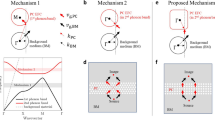 The above two mirror symmetries of the complex-valued phonon bands result from the following two symmetry properties: \(\left(1\right)\,\overline{{\omega }^{2}\left({k}_{\xi }\right)}={\omega }^{2}\left(-\overline{{k}_{\xi }}\right)\), \(\left(2\right)\,{\omega }^{2}\left(-{k}_{\xi }\right)={\omega }^{2}\left({k}_{\xi }\right)\). Herein, \(\overline{{\omega }^{2}\left({k}_{\xi }\right)}\) and \(\overline{{k}_{\xi }}\) denote the complex conjugate of \({\omega }^{2}\left({k}_{\xi }\right)\) and \({k}_{\xi }\), respectively. The symmetry property (1) simply follows from taking the complex conjugate of Eqs. (4) – (7) if the material parameters, as \(\rho\) and \({C}_{\alpha \xi \beta \eta }\), are real-valued. This condition also implies time-inversion symmetry15. We remark that symmetry (2) becomes identical to symmetry (1) for real wavenumbers. Next, we briefly show that symmetry (2) applies to complex-valued wavenumbers as well.
