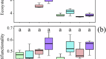 We used the Cornell Soil Health Assessment (CSHA) scoring method to calculate soil health scores82. The total data set, including 17 soil indicators (physical attributes: MWD, R0.25, SM, BD; chemical attributes: soil pH, SOC, DOC, TN, DON, NH4+-N, NO3−-N, AP, TP, AK, TK; biological attributes: MBC and MBN), were normalized as individual CSHA scores53,82. The weighting value of individual soil indicators was based on PCA of all soil indicators (Supplementary Fig. 2), representing the sum of the eigenvectors derived from the first three principal components, which were selected based on Kaiser’s cut-off (eigenvalues > 1). These first three principal components cumulatively accounted for over 70% of variance, capturing most of the variation among the soil indicators. The overall soil health score (%) was computed as a weighted average of all individual CSHA scores as follows53,82: