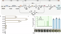 The presence of ddp-BAC::RHTTP system (pLY147) enabled the culture to grow in 1000 mM of methanol immediately and can continue to grow without a lag phase in the subsequent passages (Fig. 3c). As a comparison, the strain containing BAC::RHTTP (pLY143, without the ddp operon) grew slower and exhibited a lag phase in the second passage (Fig. 3c), except one colony. The beneficial effect of ddp-BAC::RHTTP is presumably attributed to the high copy number of RHTTP on the ddp-BAC system. To test if a high copy number plasmid (pUC19) can achieve the same effect as the ddp-BAC system, we also expressed RHTTP using pUC19. Interestingly, the pUC19::RHTTP system did not allow the strain to grow in 1000 mM of methanol (Fig. 3c), presumably due to high metabolic burden. High-copy-number plasmids often inhibit growth by diverting cellular resources away from essential components22,23,24,25. In contrast, the ddp-BAC system can adjust copy number for optimal growth. As another control, the strain without any RHTTP overexpression did not grow under the same condition (Fig. 3c).