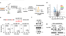 Cellular thermal shift assay experiments were performed as previously described23. Briefly, HepG2 cells were resuspended in ice-cold PBS (containing EDTA-free cocktails and 0.1% Triton) and lysed by sonication in ice and the cell lysates were collected by centrifugation (20,000 g, 30 min) at 4 °C to remove the debris. The protein concentration was determined by using the BCA protein assay kit (Pierce). 1 M FBP stock or H2O was added to the cell extract to HepG2 cell lysates (2 mg/mL) with 5 mM final FBP concentration. The samples were then incubated for 30 min at 25 °C, divided into 6 aliquots and transferred into 0.2 mL polymerase chain reaction (PCR) tubes. Each sample was heated in parallel for 3 min to the respective temperature (range: 37–62 °C). Subsequently, the samples were centrifuged at 20,000 g for 20 min at 4 °C and supernatant was collected. The supernatant was divided into two parts. One part was subjected to gel-electrophoresis for western blotting analysis, the other part of 57 °C group and 37 °C group were for in-solution digestion, dimethyl labeling and LC-MS/MS analysis (For the proteome profiling, we determined the temperature points 57 °C according to the previous TPP studies where Tm of the majority of the proteins fall at 57 °C).