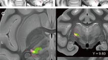 Animals underwent three scanning sessions: 1) pre-stroke (baseline), 2) < 1 h post-stroke (stroke confirmation), and 3) 30 days post-stroke. All data were acquired on an actively shielded 3 Tesla Siemens Trio scanner with a 32-channel head coil at the Queen’s University Centre for Neuroscience Studies. For the acquisition of MRI images, animals were intubated, and anesthetized (Isoflurane 1.0–1.6 %, O2 flow rate of 2 L/min) throughout scanning. The induction of anesthesia was performed in the same way as in the surgical procedure with a mixture of ketamine (7.5 mg/kg) and dexmetatomadine (0.05 mg/kg). Baseline, pre-stroke MRI acquisitions were made 48 h prior to MCAO. Baseline Scans consisted of a high-resolution, T1-weighted, magnetization-prepared rapid gradient echo (MP-RAGE TR = 1600 ms; TE = 3.92 ms, flip angle = 9°, matrix = 320 × 320, FOV 192 × 192, 120 slices and final voxel size = 0.6 × 0.6 × 0.6 mm. Baseline resting state fMRI data were also acquired using a gradient-echo echo-planar sequence sensitive to BOLD contrast, with volume repetition time (TR) = 2000 ms, T2* echo time (TE) = 28 ms, flip angle = 80°, slices matrix = 64 × 64, FOV = 768 × 768, 28 slices and a final voxel size = 2 × 2 × 2 mm. In all monkeys, the slices were acquired using contiguous, interleaved acquisition with 353 functional volumes total (11 min. 46 seconds). Immediately following MCAO, animals underwent imaging to confirm vessel occlusion post-stroke using a high-resolution MRA sequence; TR = 39 ms; TE = 7.33 ms, flip angle=15°, matrix=448 × 448, FOV 112 × 112mm2 and final voxel size=0.3 × 0.3 × 1 mm3. At thirty days post-stroke, resting state fMRI was again acquired using the same parameters as above. A T2-weighted Fast Spin-Echo was also acquired; TR = 9270 ms; TE = 65 ms, flip angle=157°, matrix=256 × 256, FOV 154 × 154 mm2, 100 slices and final voxel size=0.6 × 0.6 × 0.6 mm3. All images were downloaded in DICOM format and converted to NIfTI format using dcm2niix from MRIcron112.