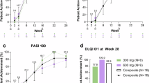 Physician-reported efficacy outcomes included the Psoriasis Area and Severity Index (PASI), which scores the severity of disease on a scale from 0 to 72 (where a score of 72 indicates extreme disease severity) by combining assessments of the extent of body surface involvement in the head, trunk, arms, and legs together with the severity of desquamation, erythema, and lesion induration/infiltration (thickness) in each region; the target lesion Total Sign Score (TSS)61, the sum of erythema, scaling, and lesion elevation scores, each on a 4-point scale (0 to 3, with 0 indicating a grade of clear and 3 indicating a grade of severe to very severe); and the static Physician’s Global Assessment (sPGA), with overall lesions graded for induration, erythema, and scaling (range 0 to 4), defined as the sum of 3 scores divided by 3 and rounded to the nearest whole number for analysis of responder rates. An sPGA (0,1) response was defined as a post-baseline sPGA score of 0 or 1. Patient-reported outcomes and quality-of-life measures included the itch numerical rating scale (NRS), an 11-point, horizontal scale anchored at 0 and 10, with 0 representing no itch and 10 representing worst itch imaginable to describe the worst level of itching in the past 24 hours62,63, and the Patient’s Global Assessment of Disease Severity (PGA) ranking the severity of PsO on a 0 (clear; no PsO) to 5 (severe; worst their PsO has ever been) NRS. Per protocol, efficacy data, including PASI were to be collected in follow-up visits during the study after patients had stopped treatment. No follow-up efficacy data were collected for patients who discontinued treatment as they discontinued the study at the same time.